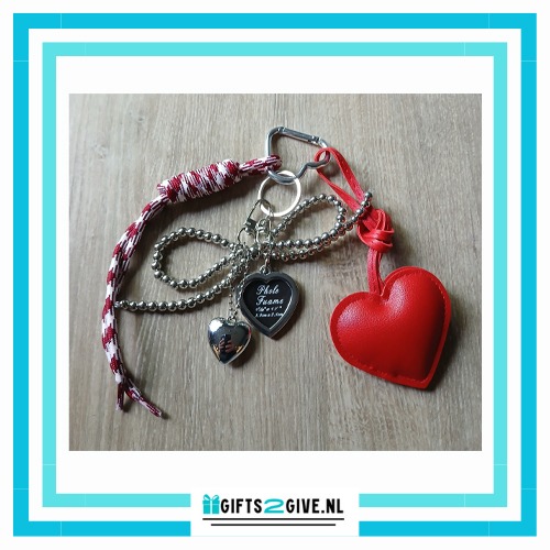Prachtige bag charm met een rood hart, een strik van zilveren kralen en een fotol;ijstje voor de foto van je geliefde.