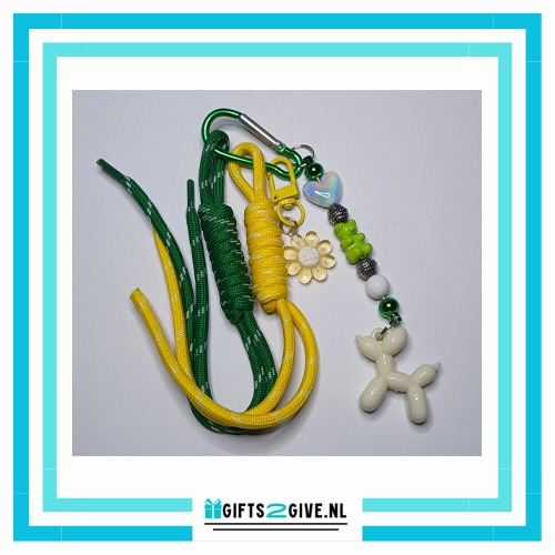 Deze charmante hanger bestaat uit een ballonhondje, twee gekleurde veters en een lief bloemetje, allemaal bevestigd aan een stevige sleutelhangerhaak.