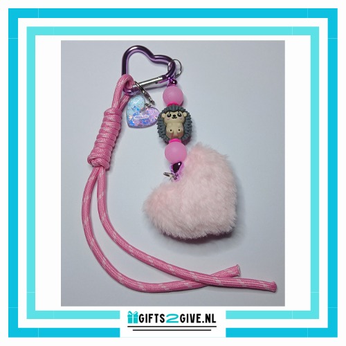 Deze charmante hanger bestaat uit een egeltje, gekleurde veter en een lief hartje, allemaal bevestigd aan een stevige sleutelhangerhaak.