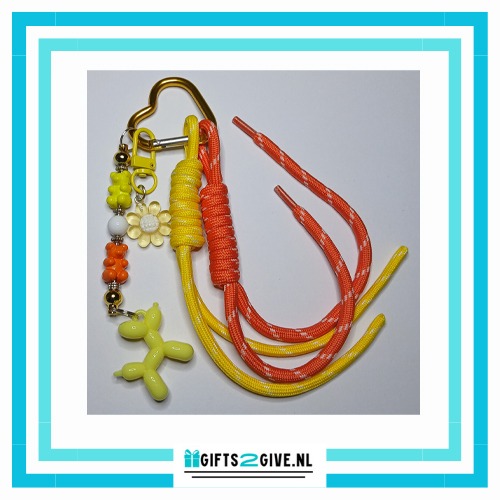 Deze charmante hanger bestaat uit een ballonhondjetwee gekleurde veters en een lief bloemetje, allemaal bevestigd aan een stevige sleutelhangerhaak.