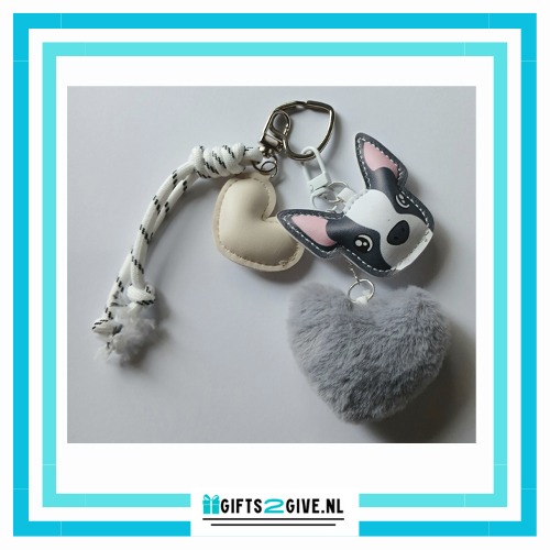 Tasbedel met een pu leren franse bulldog, en hart pompom.