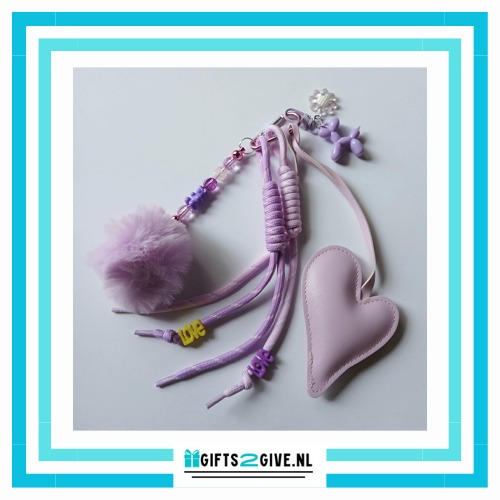 Tas bedel met een pu lila hart, een ballonhondje, een pluche pompom.