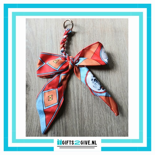 Deze elegante tasbedel in de vorm van een strik met een oranje accent geeft je tas een vrolijke en stijlvolle uitstraling.