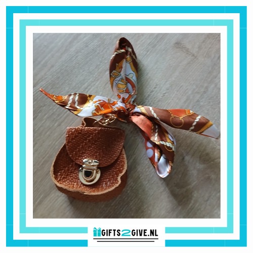 Deze stijlvolle tasbedel met een klein bruin tasje en een sierlijk sjaaltje is de perfecte finishing touch voor elke tas.