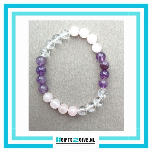 De armband is samengesteld uit 8 mm kralen van amethist, rozenkwarts en bergkristal – een krachtige combinatie die bekendstaat om haar harmoniserende werking: