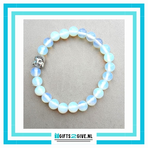 De armband is gemaakt van 8 mm opalietkralen, een steen die bekendstaat om haar rustgevende en helende eigenschappen.