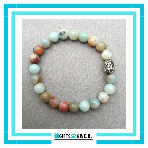 De armband is gemaakt van 8 mm amazonietkralen, een steen die bekendstaat om haar kalmerende en harmoniserende eigenschappen.