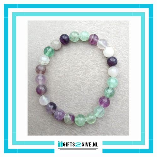 De armband is gemaakt van 8 mm fluorietkralen, een steen die bekendstaat om haar zuiverende en stabiliserende eigenschappen. Fluoriet helpt negatieve energie te neutraliseren, bevordert mentale helderheid en ondersteunt concentratie en evenwicht.