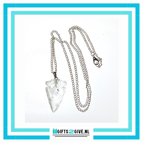 Bergkristal in de vorm van een pijlpunt met zilverkleurig hangertje.