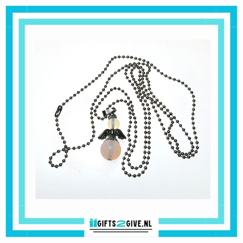 Deze engelhanger is volledig gemaakt van opalietkralen en straalt een zachte, kalmerende energie uit.