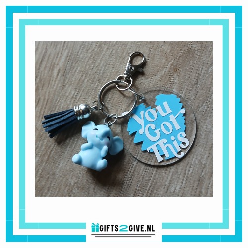 Deze inspirerende sleutelhanger combineert een schattig olifant-bedeltje met een helder plexiglas rondje waarop de tekst “You Got This” staat.