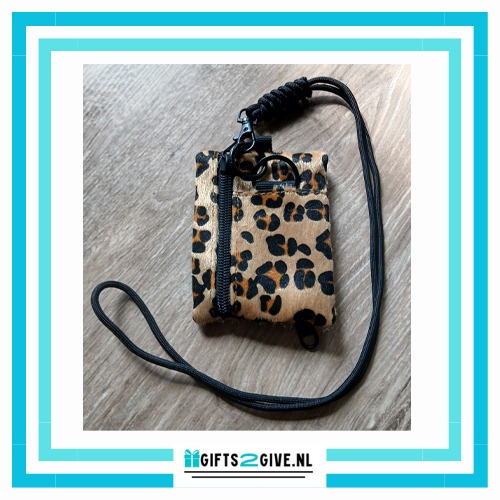 Deze trendy telefoonkoord sleutelhanger met een mini portemonnee in panterprint is zowel praktisch als een echte eyecatcher.