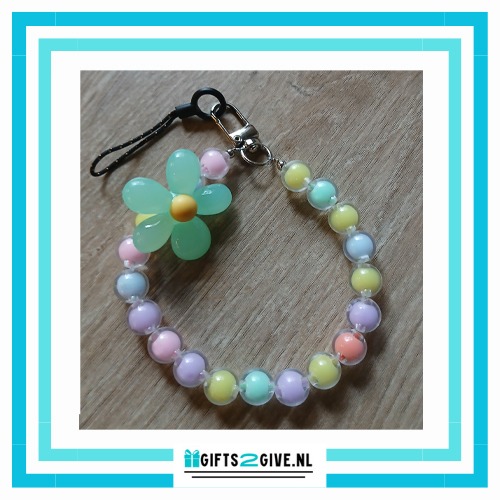 Het stevige lusje maakt het eenvoudig om je telefoon veilig vast te houden, terwijl de kleurrijke kralen en het schattige bloembedel een speels en fleurige touch geven.